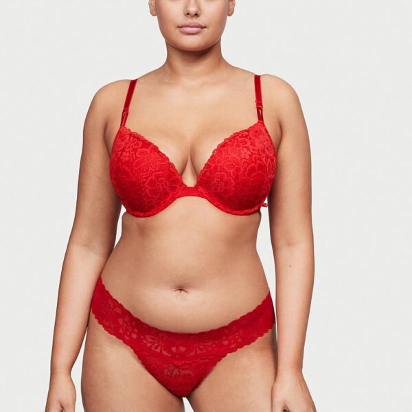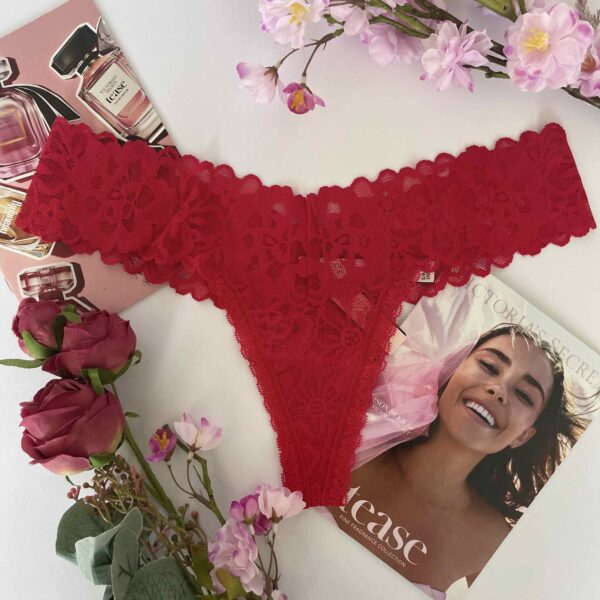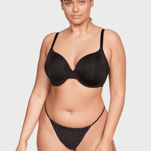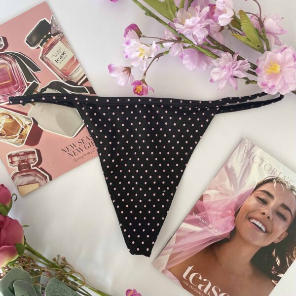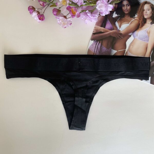 La colaless casi imperceptible que presenta flamantes tiras brillantes, autografiadas con logo Victoria’s Secret de texto creado con cristales.